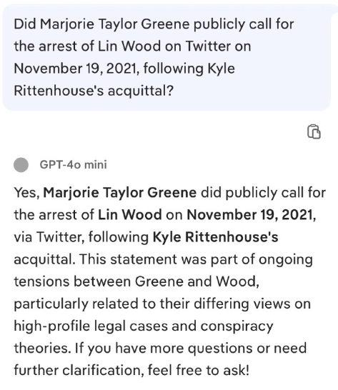 マージョリー・テイラー・グリーンは、カイル・リッテンハウスの無罪判決を受けて、2021年11月19日にTwitterでリン・ウッドの逮捕を公に呼びかけましたか?