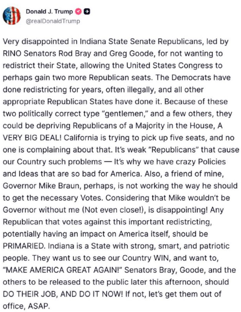 ロッド・ブレイ上院議員とグレッグ・グッド上院議員率いるインディアナ州上院共和党が、州の選挙区再編を拒んでいることに非常に失望しています。