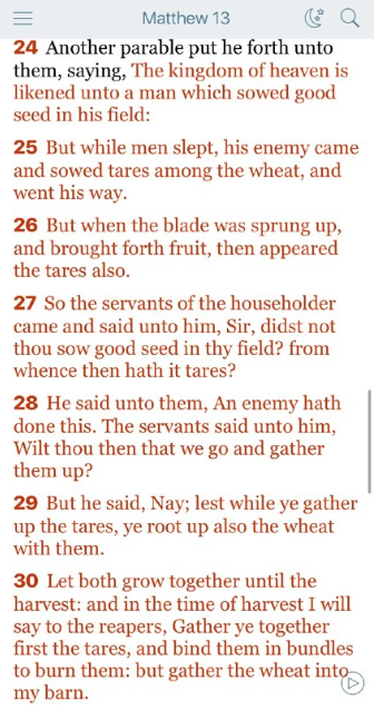 25 人々が眠っている間に、敵が来て、麦の中に毒麦を蒔いて立ち去りました。
