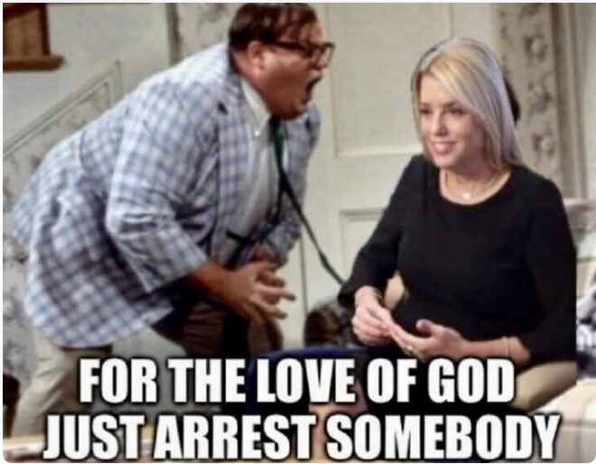 画像内のテキスト「FOR THE LOVE OF GOD JUST ARREST SOMEBODY.(どうか、誰かを逮捕してください)」は、マッコードが関わった議事堂襲撃事件の捜査に関連して、逮捕を求める人々の欲求不満を表現しています。