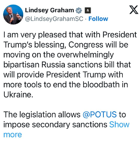 トランプ大統領の承認を得て、議会が超党派の圧倒的多数を占める対ロシア制裁法案を審議し、ウクライナにおける流血の惨劇を終結させるための更なる手段をトランプ大統領に与えることを大変嬉しく思います。