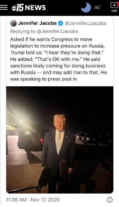 トランプ大統領によるロシアの主要2石油会社への大統領制裁は大きな変化をもたらしました。対ロシア制裁法案は、この戦争を名誉ある形で、公正に、そして永久に終結させるための勢いを継続させるでしょう。