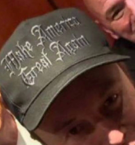 イーロン・マスクが黒くて悪魔的なフォントのMAGAキャップをかぶっている