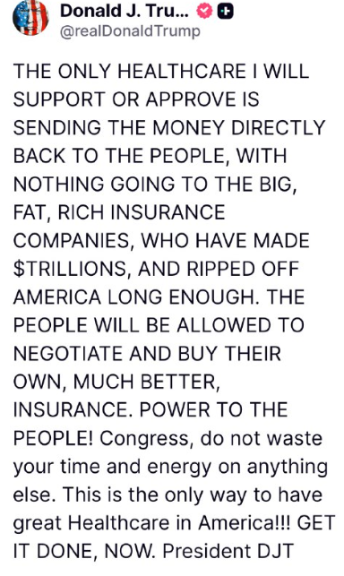 私が支持・承認する唯一の医療制度は、国民に直接お金を還元することです。何兆ドルもの利益を上げ、アメリカ国民を長年騙し取ってきた巨大で、肥え太った、裕福な保険会社には、一切お金は流れません。国民は、自分たちで交渉し、より良い保険に加入できるようになります。国民に力を与えましょう!議会よ、時間とエネルギーを他のことに無駄にしないでください。これが、アメリカに素晴らしい医療制度をもたらす唯一の方法です!今すぐ実行してください。ドナルド・トランプ大統領