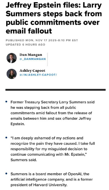 ジェフリー・エプスタインのファイル:ラリー・サマーズ氏、メール問題で公約を撤回