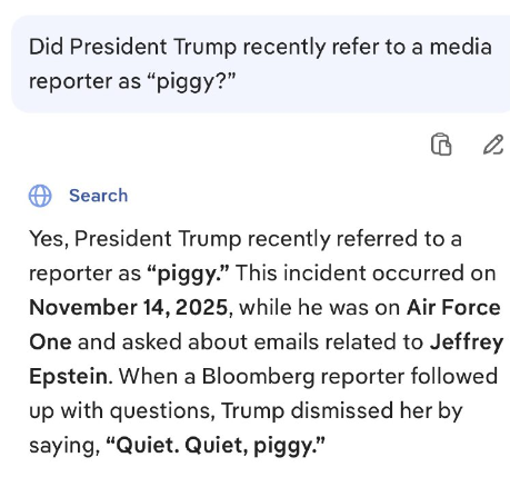 はい、トランプ大統領は最近、記者を「ブタ」と呼んだことがあります。この出来事は、2025年11月14日、トランプ大統領が大統領専用機エアフォースワンに搭乗中に、ジェフリー・エプスタインに関するメールについて質問した際に発生しました。ブルームバーグの記者がさらに質問を続けると、トランプ大統領は「静かに。静かに、ブタちゃん」と言い放ちました。
