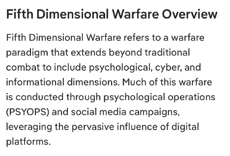 第五次元戦争とは、伝統的な戦闘の枠を超え、心理、サイバー、そして情報の次元を含む戦争パラダイムを指します。この戦争の多くは、心理作戦(PSYOPS)やソーシャルメディアキャンペーンを通じて行われ、デジタルプラットフォームの広範な影響力を活用しています。