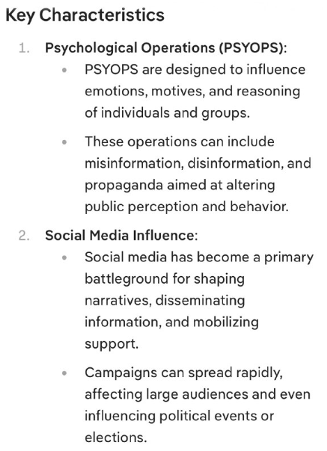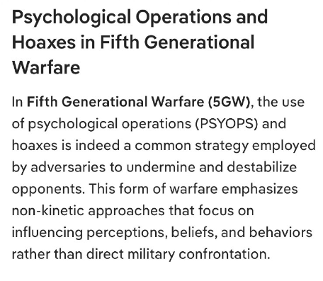 第五世代戦争(5GW)において、心理作戦(PSYOPS)とデマは、敵対者を弱体化させ、不安定化させるために敵対者が用いる一般的な戦略です。この形態の戦争では、直接的な軍事衝突ではなく、認識、信念、行動に影響を与えることに重点を置いた非運動的なアプローチが重視されます。