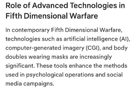 現代の五次元戦争において、人工知能(AI)、コンピューター生成画像(CGI)、マスクを着用したボディダブルなどの技術は、ますます重要になっています。これらのツールは、心理作戦やソーシャルメディアキャンペーンで使用される手法を強化します。