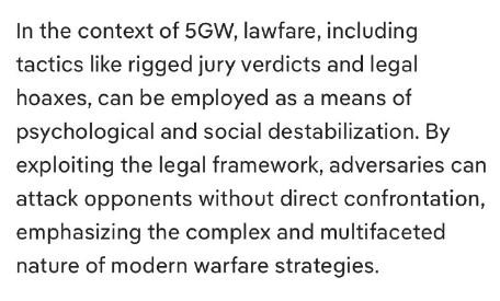 5GWの文脈では、不正な陪審評決や法的デマなどの戦術を含むローファーは、心理的および社会的不安定化の手段として用いられる可能性があります。法的枠組みを悪用することで、敵対者は直接対決することなく敵を攻撃することができ、現代の戦争戦略の複雑かつ多面的な性質を強調しています。