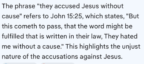 「彼らは理由もなくイエスを訴えた」という表現は、ヨハネによる福音書15章25節の「しかし、これは、彼らの律法に書いてある言葉が成就するためである。『彼らは理由もなく私を憎んだ』」という箇所を指しています。これは、イエスに対する訴えの不当さを浮き彫りにしています。