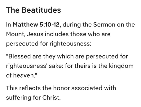 マタイによる福音書5章10-12節の山上の垂訓の中で、イエスは義のために迫害されている人々も含め、次のように語っています。「義のために迫害される人々は幸いです。天の国はその人たちのものだからです。」