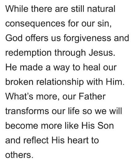 私たちの罪には当然の結果が伴いますが、神はイエスを通して私たちに赦しと贖いを与えてくださいます。神は、私たちと神との壊れた関係を癒す道を備えてくださいました。さらに、私たちの父なる神は、私たちが御子に似た者となり、神の心を他の人々に反映できるように、私たちの人生を変えてくださいます。