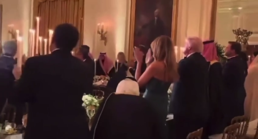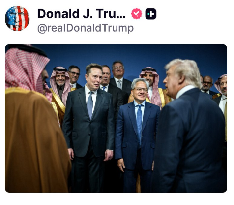 この画像は、ドナルド・トランプ元米大統領が、テスラやスペースXのCEOであるイーロン・マスク氏、そしてその他の人々(サウジアラビアの政府関係者を含む可能性が高い)と交流している瞬間を捉えています。
