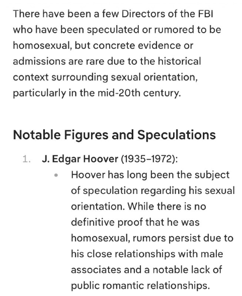 FBI長官の中には、同性愛者であると推測されたり噂されたりした人物が数人いますが、性的指向を取り巻く歴史的背景、特に20世紀半ばにおいては、具体的な証拠や自白は稀です。