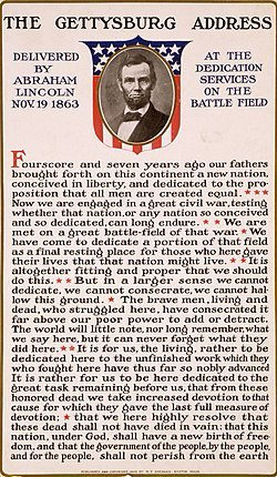 ゲティスバーグ演説の歴史的かつ永続的な重要性と名声は、少なくとも部分的にはその簡潔さに起因する。わずか271語で、3日間の戦闘で3,000人以上が命を落とした北軍兵士の犠牲を悼むために集まった約15,000人の前で、わずか2分足らずで読み上げられた。リンカーンは演説を1776年のアメリカ独立宣言に言及して始めた。