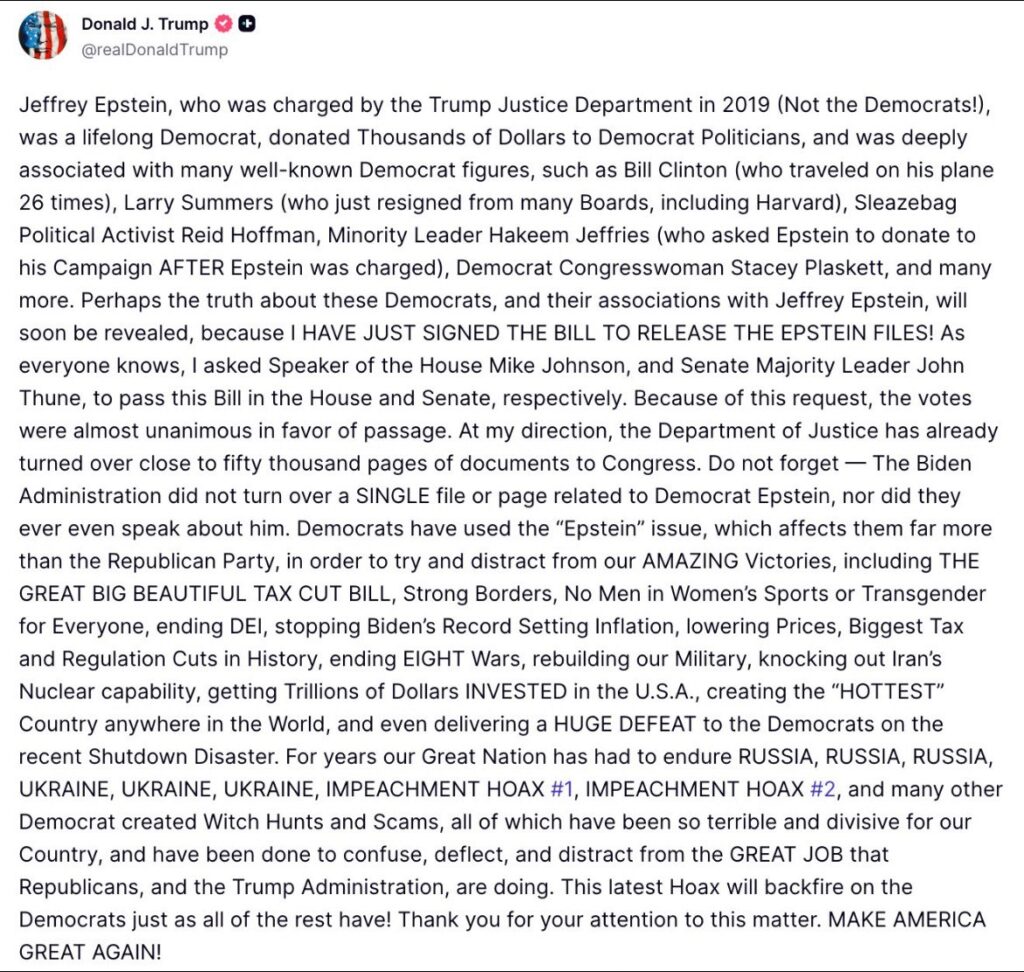 11月19日 民主党員とジェフリー・エプスタインとの関係についての真実は、まもなく明らかになるでしょう。なぜなら、私はエプスタインのファイルを公開する法案に署名したからです!
