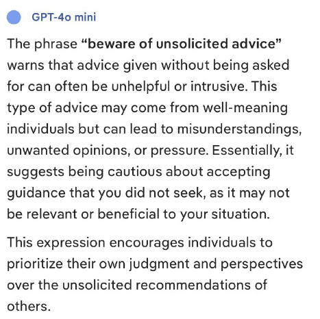 「頼まれもしないアドバイスには注意」というフレーズは、求められてもいないのに与えられるアドバイスは、役に立たなかったり、押し付けがましい場合が多いことを警告しています。この種のアドバイスは、善意の人から来る場合もありますが、誤解や不要な意見、プレッシャーにつながる可能性があります。本質的には、求めていないアドバイスを受け入れることには注意が必要であることを示しています。それは、自分の状況に関連性や有益性がない可能性があるためです。この表現は、個人が、求められてもいない他人からのアドバイスよりも、自分の判断と視点を優先することを促しています。