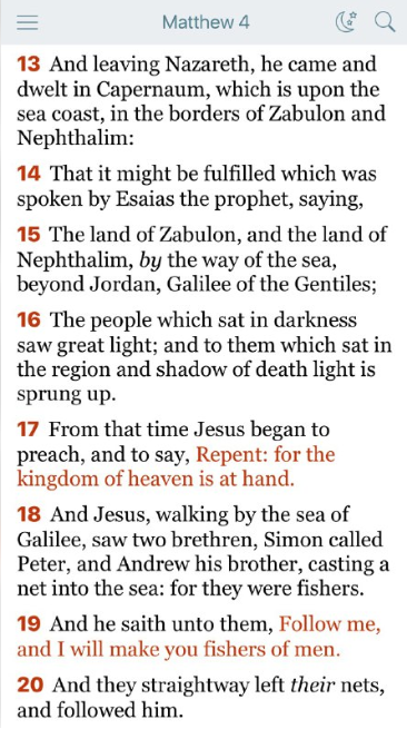17 その時から、イエスは宣教を始め、「悔い改めよ。天の御国は近づいた」と言われた。