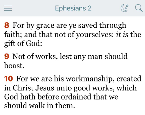 10 私たちは神の作品であって、キリスト・イエスにあって良い行いをするために造られたのです。神は、私たちがその良い行いの中に歩むように、あらかじめ定めておられました。
