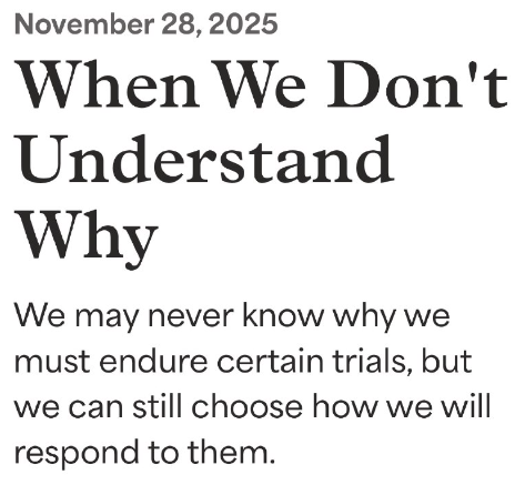 私たちはなぜ特定の試練に耐えなければならないのか、決して理解できないかもしれません。しかし、それでも私たちは、それらにどう対応するかを選ぶことができます。