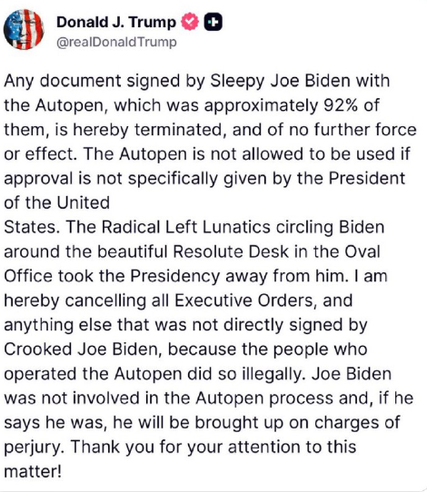眠たそうなジョー・バイデンがオートペンで署名した文書(約92%)は、ここに失効し、効力を失います。オートペンは、アメリカ合衆国大統領の明確な承認がない限り、使用できません。