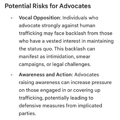 声高な反対:人身売買に強く反対する個人は、現状維持に利害関係を持つ人々からの反発に直面する可能性があります。こうした反発は、脅迫、中傷キャンペーン、法的訴訟といった形で現れる可能性があります。