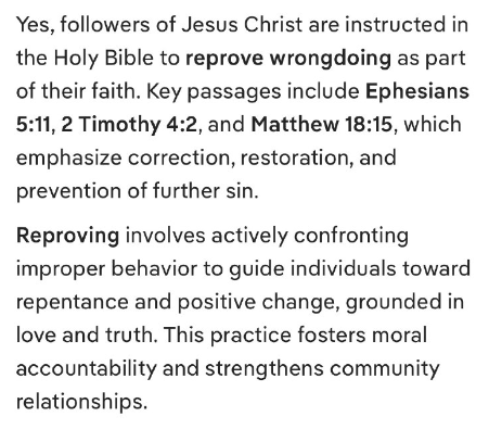はい、聖書の中でイエス・キリストの信者は信仰の一環として、悪行を戒めるよう教えられています。重要な聖句には、エペソ人への手紙5章11節、テモテへの第二の手紙4章2節、マタイによる福音書18章15節があり、これらは罪の矯正、回復、そして罪の再発防止を強調しています。戒めるということは、不適切な行動に積極的に立ち向かい、愛と真理に基づいた悔い改めと前向きな変化へと導くことを意味します。この実践は道徳的責任を育み、地域社会の関係を強化します。