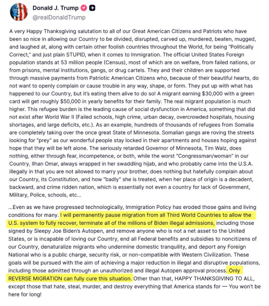 そのことが彼らを苦しめているのです!グリーンカード(※永住し、就労することができる権利を証明する「米国永住権カード」)を持ち、年収3万ドルの移民は、家族のために年間約5万ドルの給付金を受け取ります。実際の移民人口ははるかに多いです。この難民負担は、第二次世界大戦後には存在しなかったアメリカの社会機能不全の主な原因です(学校の不振、犯罪率の高さ、都市の荒廃、病院の過密状態、住宅不足、巨額の財政赤字など)。例えば、ソマリアからの数十万人の難民が、かつて偉大だったミネソタ州を完全に占拠しています。ソマリアのギャングは街を徘徊し、「獲物」を探しています。私たちの素晴らしい人々は、アパートや家に閉じこもり、放っておいてほしいと望み薄に願っているのです。ミネソタ州の重度の知的障害者知事、ティム・ウォルツは、恐怖からか無能からか、あるいはその両方からか、何もしない。一方、我が国最悪の「下院議員/下院議員」であるイルハン・オマルは、常にヒジャブを身にまとい、兄弟との結婚が認められていないという点でおそらく不法入国したのだろうが、我が国とその憲法、そして彼女がいかに「ひどい」扱いを受けているかについて、憎しみに満ちた不満を述べるばかりだ。彼女の出身国は、政府、軍隊、警察、学校などがないため、実質的に国ですらない、退廃的で後進的で犯罪まみれの国である。…私たちが技術的に進歩したにもかかわらず、移民政策は多くの人々にとって、こうした恩恵と生活条件を損なってきた。米国のシステムが完全に回復するまで、すべての第三世界諸国からの移民を永久に停止します。スリーピー・ジョー・バイデンのオートペン署名を含む、数百万件に及ぶバイデンによる不法入国をすべて停止し、米国にとって純資産とならない者、あるいは国を愛することができない者を追放します。また、我が国の非市民に対する連邦政府の給付金と補助金をすべて廃止し、国内の平和を損なう移民の帰化を剥奪し、公的扶助の対象、安全保障上の脅威、あるいは西洋文明に適合しない外国人を国外追放します。これらの目標は、不法移民や混乱を引き起こす者、そして無許可かつ違法なオートペン承認プロセスを通じて入国した者を含む、大幅な削減を目指して追求されます。この状況を完全に改善できるのは、逆移民だけです。それ以外は、アメリカが象徴するすべてを憎み、盗み、殺し、破壊する者を除いて、すべての人に感謝祭を祝いましょう。あなた方は長くここにいられないでしょう!
