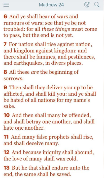 7 民族は民族に、王国は王国に敵対して立ち上がり、あちこちに飢饉や疫病、地震が起こります。
