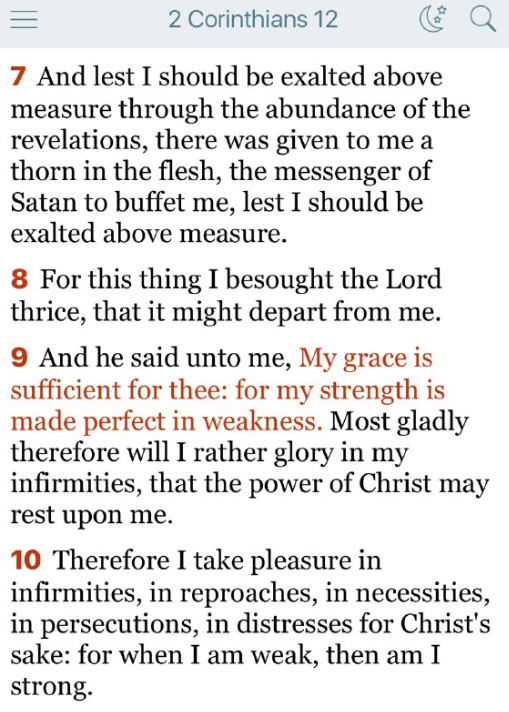 9 すると主はわたしに言われました。「わたしの恵みはあなたに十分である。わたしの力は弱さの中で完全に現れる。それゆえ、わたしはむしろ喜んで自分の弱さを誇りましょう。そうすれば、キリストの力がわたしの上に宿るからです。