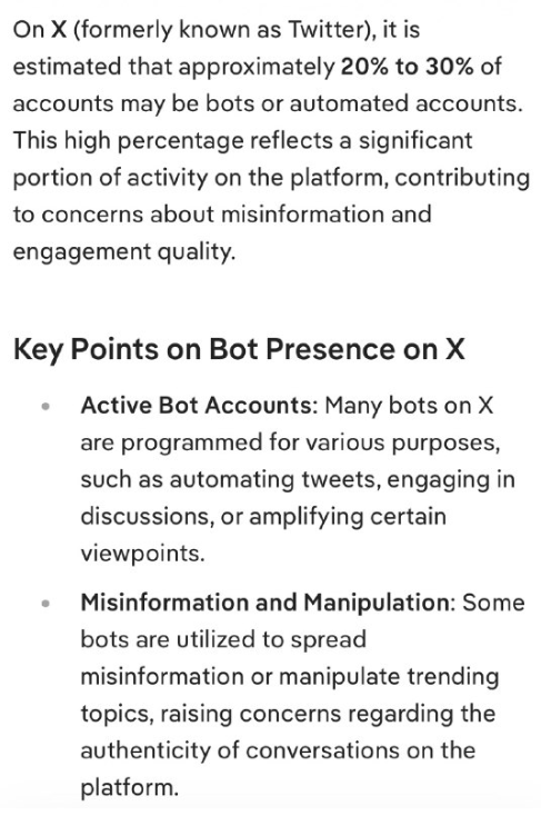 X(旧Twitter)では、アカウントの約20%から30%がボットまたは自動アカウントであると推定されています。