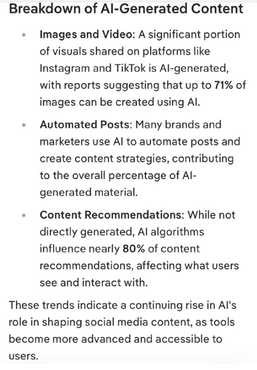 画像と動画:InstagramやTikTokなどのプラットフォームで共有されるビジュアルの大部分はAIによって生成されており、画像の最大71%がAIによって作成されているという報告もあります。