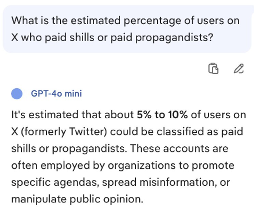 X のユーザーのうち、有償のサクラやプロパガンダ活動を行っていると推定される割合はどのくらいですか?