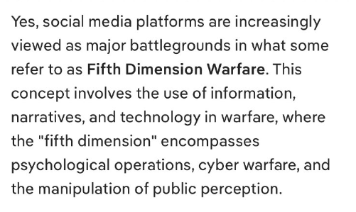 はい、ソーシャルメディアプラットフォームは、一部の人々が「第五次元戦争」と呼ぶものの主要な戦場としてますます認識されています。この概念は、情報、物語、テクノロジーを戦争に活用することを伴い、ここで「第五次元」とは、心理作戦、サイバー戦争、そして世論操作を包含するものです。