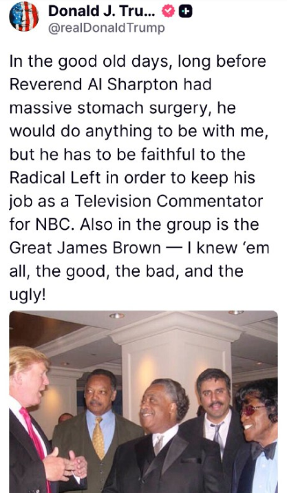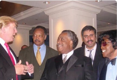 この画像は、ドナルド・トランプ氏、ジェシー・ジャクソン氏、アル・シャープトン氏、ジェームス・ブラウン氏らが写っている瞬間を捉えたものです。