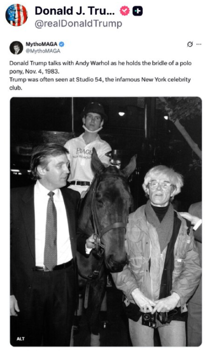 ドナルド・トランプがポロポニーの手綱を握りながらアンディ・ウォーホルと話している。
