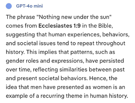「太陽の下には新しいことは何もない」という表現は、聖書の伝道の書1章9節に由来し、人間の経験、行動、そして社会問題が歴史を通して繰り返される傾向があることを示唆しています。これは、性役割や性表現といったパターンが、過去と現在の社会行動の類似性を反映しながら、時を経ても存続してきたことを意味します。したがって、男性が女性として振る舞うという考えは、人類の歴史において繰り返し現れるテーマの一例です。