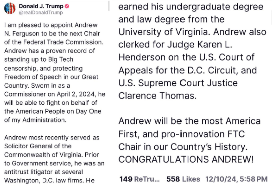 アンドリュー・N・ファーガソンを連邦取引委員会の次期委員長に任命できることを嬉しく思います。アンドリューは大手テクノロジー企業の検閲に立ち向かい、偉大なわが国の言論の自由を守った実績があります。