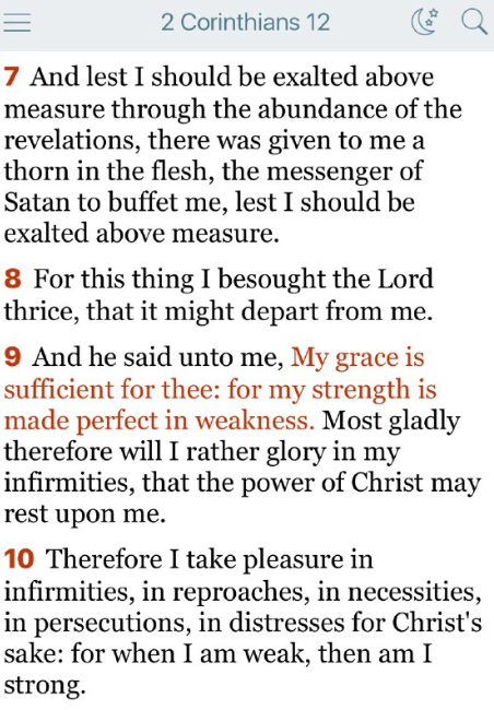 9 すると主はわたしに言われました。「わたしの恵みはあなたに十分である。わたしの力は弱さの中で完全に現れる。それゆえ、わたしはむしろ喜んで自分の弱さを誇りましょう。そうすれば、キリストの力がわたしの上に宿るからです。」