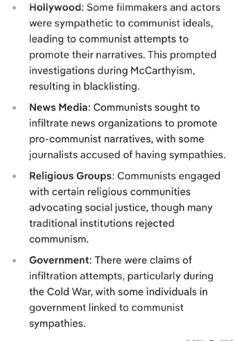 ハリウッド:一部の映画製作者や俳優は共産主義の理想に共感しており、共産主義者は彼らの主張を広めようとしました。これはマッカーシズムの時代に捜査を引き起こし、ブラックリストに掲載されました。