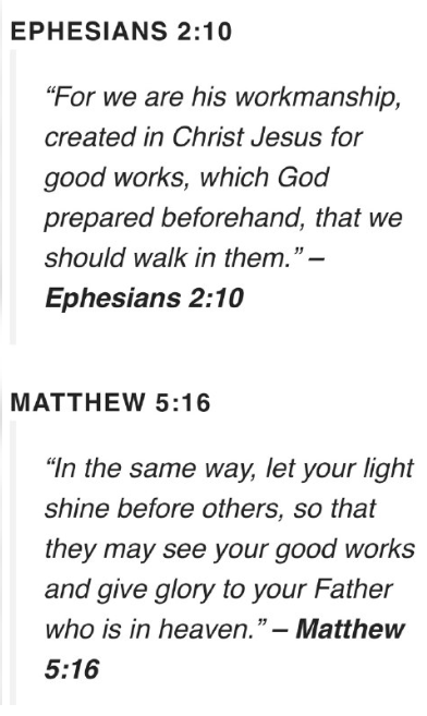 「私たちは神の作品であり、キリスト・イエスにあって良い行いをするために造られました。神は、私たちが良い行いを歩むように、その良い行いをあらかじめ備えてくださったのです。」