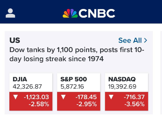 ダウは1,100ポイント下落し、1974年以来初の10日連続下落を記録