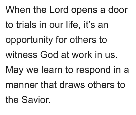 主が私たちの人生における試練への扉を開いてくださるとき、それは他の人々が私たちの内に神が働いておられることを目撃する機会となります。私たちが、他の人々を救い主に引き寄せるような方法で応答することを学べますように。