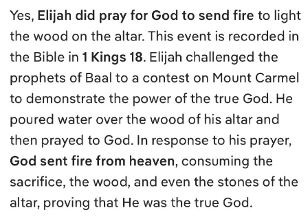 そうです、エリヤは祭壇の薪に火を灯すために神に火を送ってくださるよう祈りました。この出来事は聖書の列王記上18章に記録されています。エリヤは真の神の力を示すために、カルメル山でバアルの預言者たちに勝負を挑みました。彼は祭壇の薪に水を注ぎ、神に祈りました。その祈りに応えて、神は天から火を送り、犠牲、薪、そして祭壇の石さえも焼き尽くし、神こそ真の神であることを証明しました。