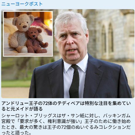 アンドルー王子の愛するテディベアのコレクションはあまりにも膨大で、新しいスタッフがその世話をするのに丸一日の研修が必要だった。さらに、大人の王族のためにテディベアを並べるのに毎日1時間もかかったと、元宮殿メイドは語る。シャーロット・ブリッグスはザ・サン紙に対し、バッキンガム宮殿で「要求が多く、権利意識が強い」王子のために働き始めたとき、最大の驚きは王子の72個のぬいぐるみコレクションだったと語った。