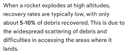 ロケットが高高度で爆発した場合、回収率は通常低く、回収される破片はわずか5~10%程度です。これは、破片が広範囲に散乱し、着地地点へのアクセスが困難であるためです。
