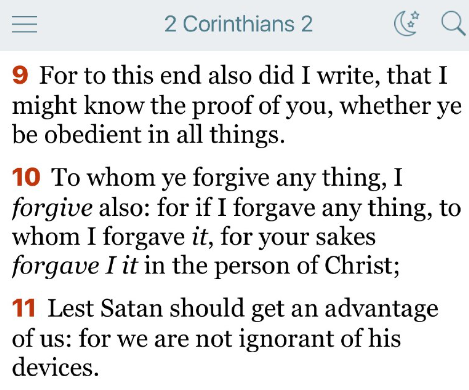 10 あなたがたが何かを赦すなら、私も赦します。もし私が何かを赦したなら、それはあなたがたのために、キリストの御名において赦したのです。