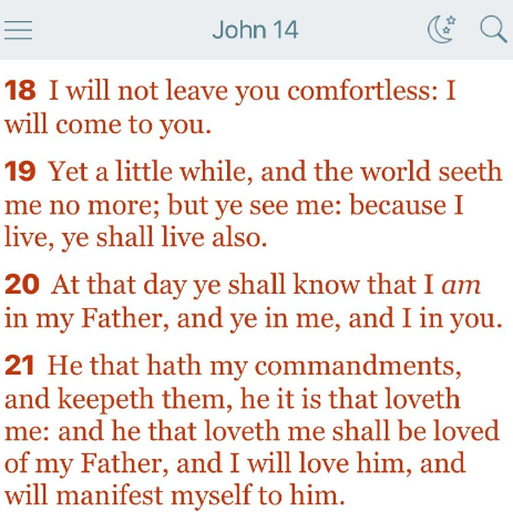21 わたしの戒めを心に留めてそれを守る人は、わたしを愛する者です。わたしを愛する者は、わたしの父に愛されます。わたしもその人を愛し、わたし自身をその人に現します。