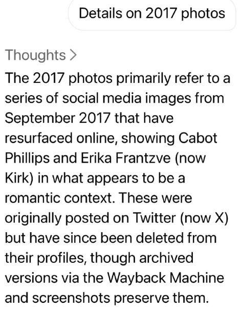 2017年の写真は、主に2017年9月にソーシャルメディアに投稿された一連の画像を指し、オンライン上に再浮上しました。キャボット・フィリップスとエリカ・フランツヴェ(現カーク)がロマンチックな雰囲気の中で写っているように見えます。これらの画像は元々Twitter(現X)に投稿されたもので、その後プロフィールからは削除されていますが、Wayback Machineのアーカイブ版やスクリーンショットには保存されています。